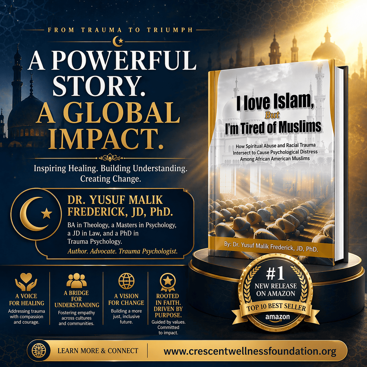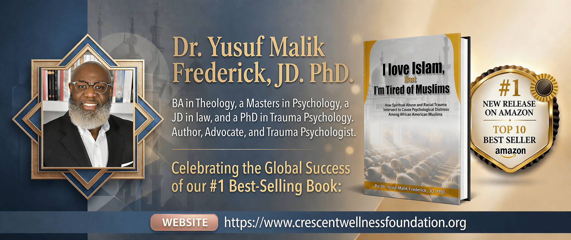 Dr. Yusuf Malik Frederick is a pioneering scholar, researcher, and spiritual healing advocate who holds a Ph.D. in Trauma Psychology, a J.D. in Law, and a B.A. in Theology and Biblical Languages. His interdisciplinary work is deeply rooted in the study of compound trauma, with a particular focus on the intersection of spiritual abuse and racial trauma within the African American Muslim community and other marginalized groups.